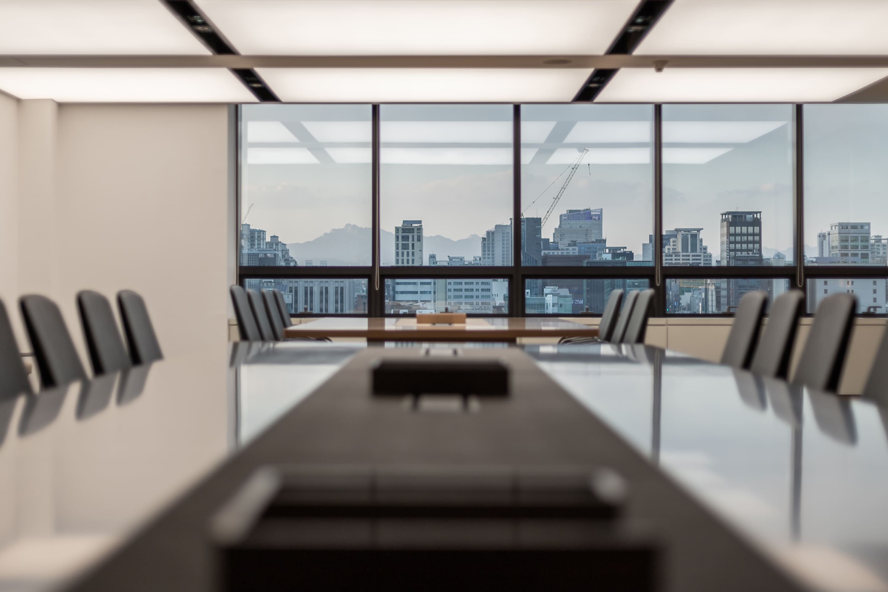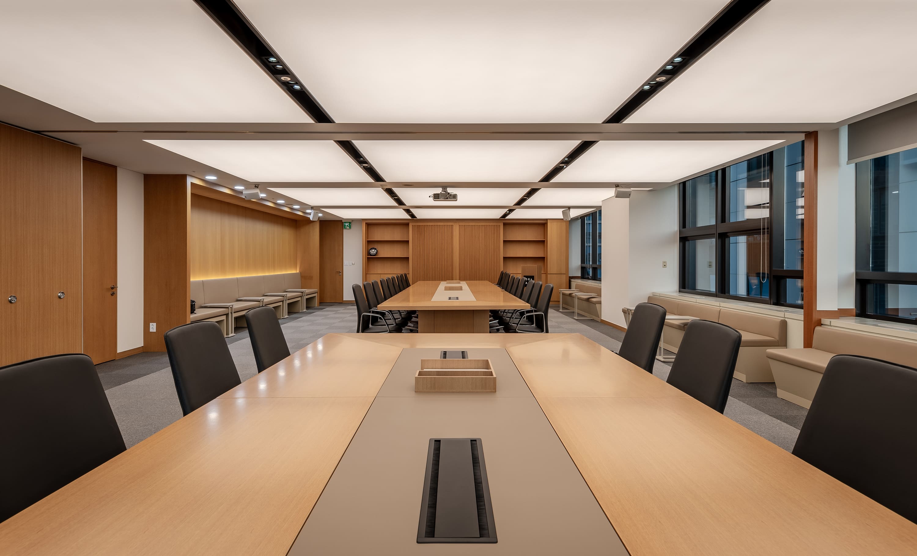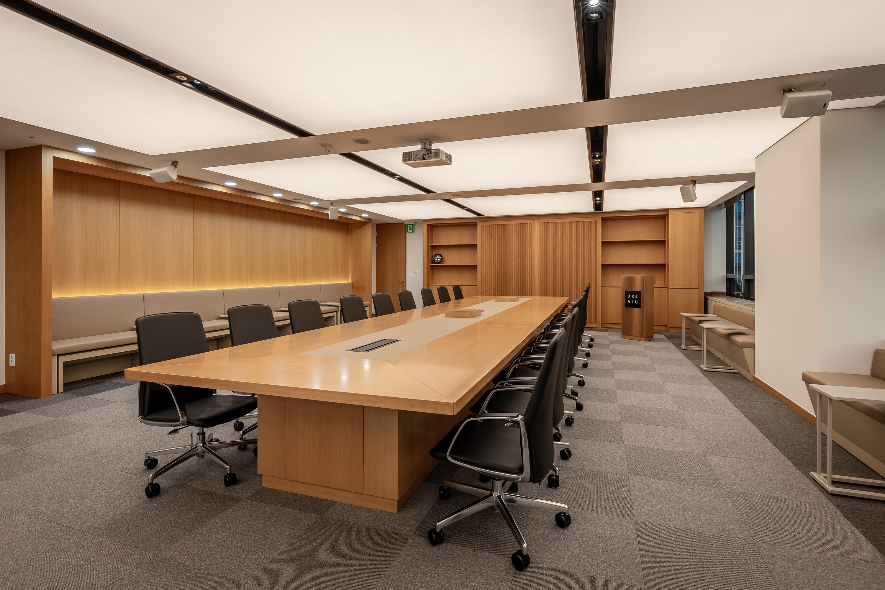 길게 이어진 원목 테이블을 중심으로집중과 소통이 자연스럽게 이루어지는 공간입니다.천장 전체에 고르게 퍼지는 조명은회의 전반을 안정적으로 비추며장시간 논의에도 편안한 환경을 제공합니다.