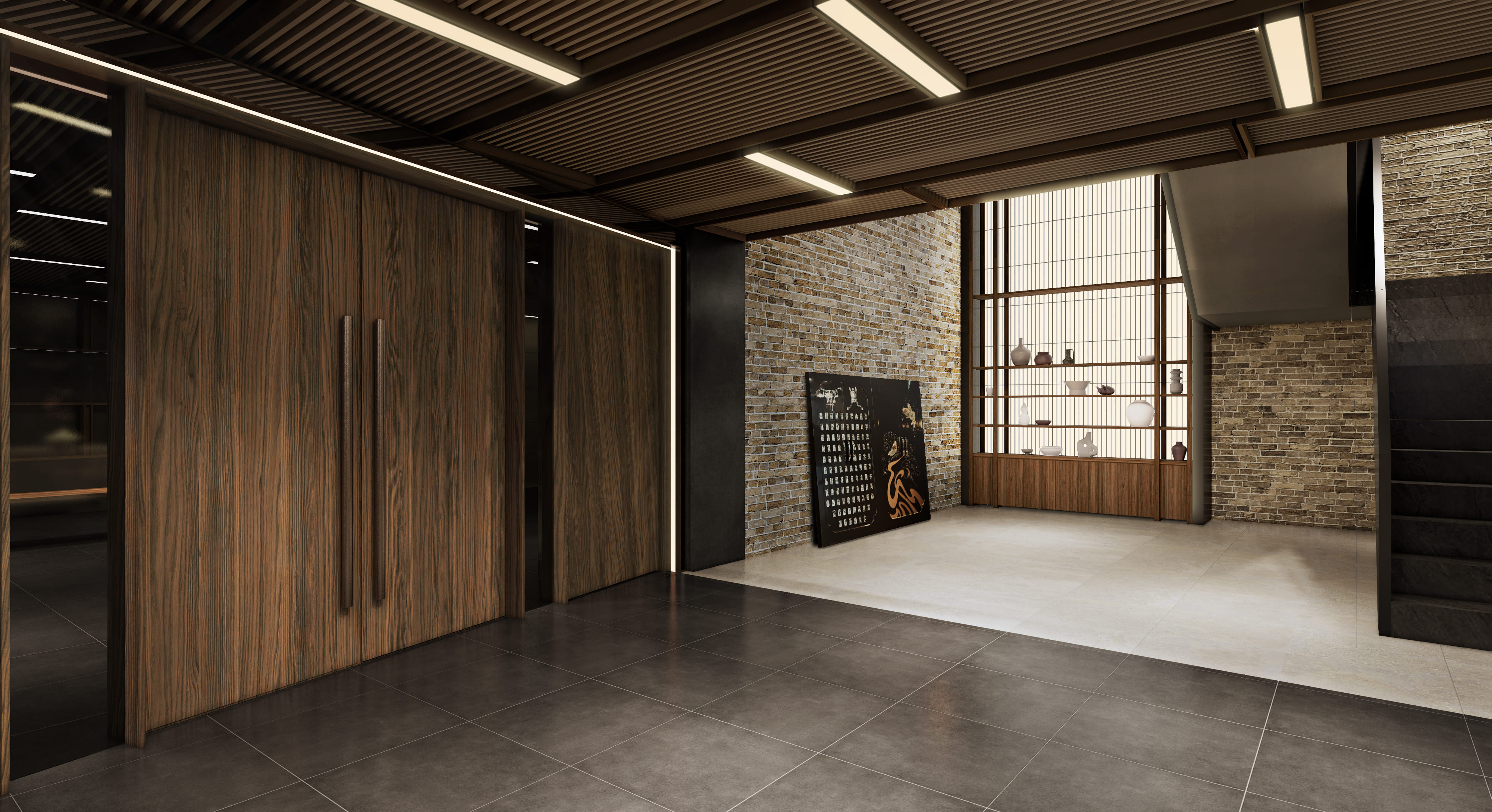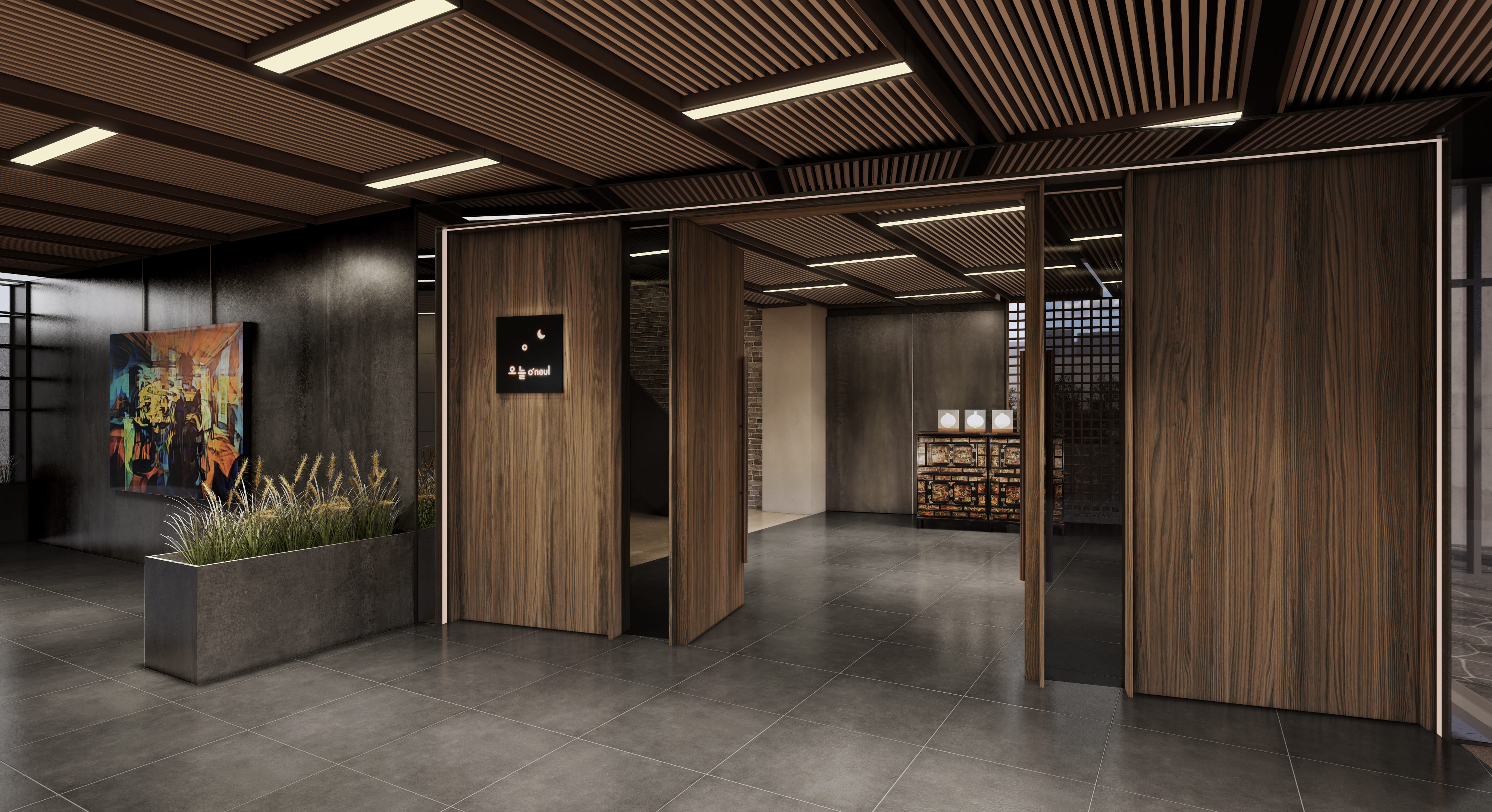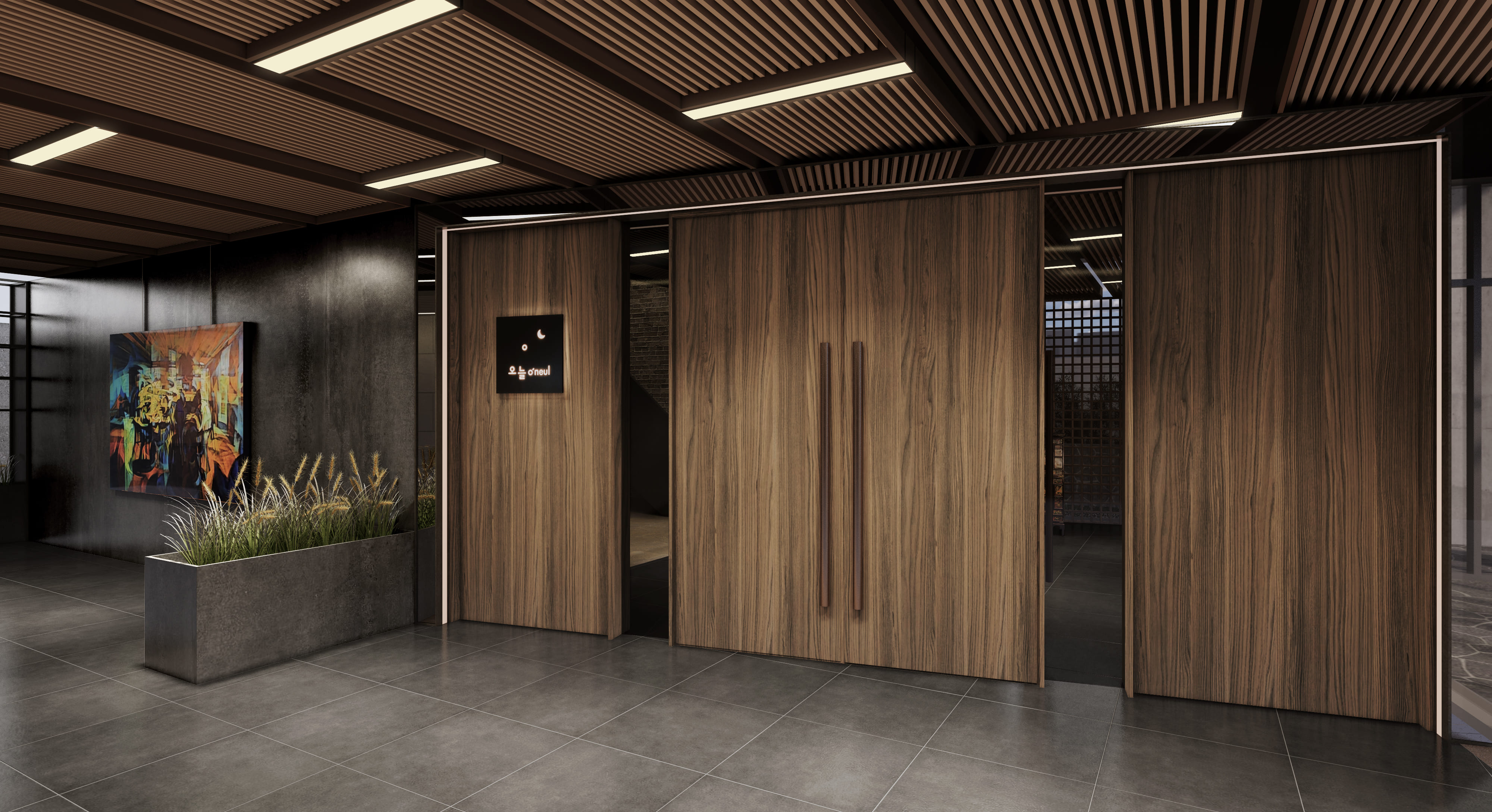 문을 여는 순간 커다란 우드 도어와 정돈된 조명이
