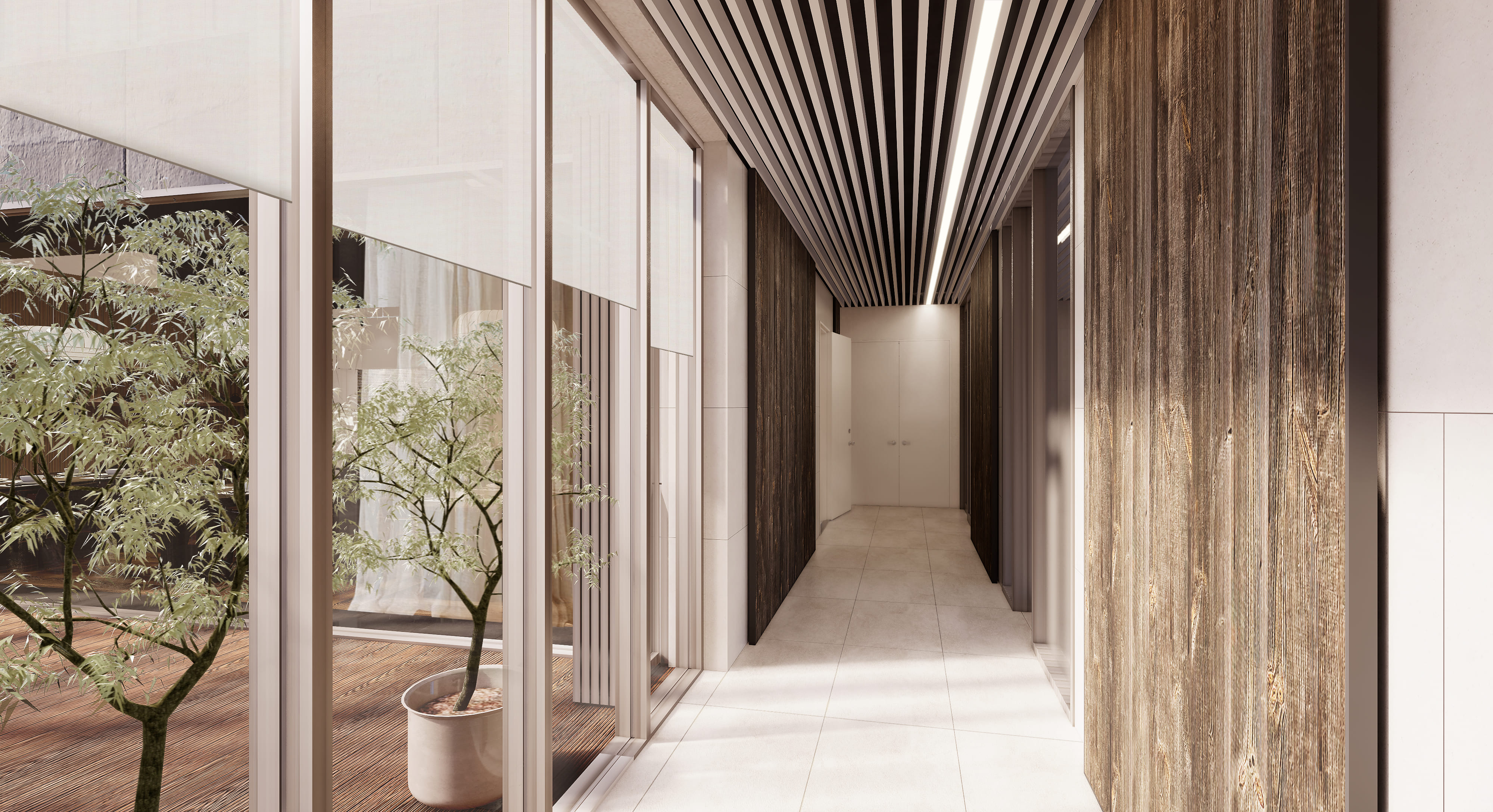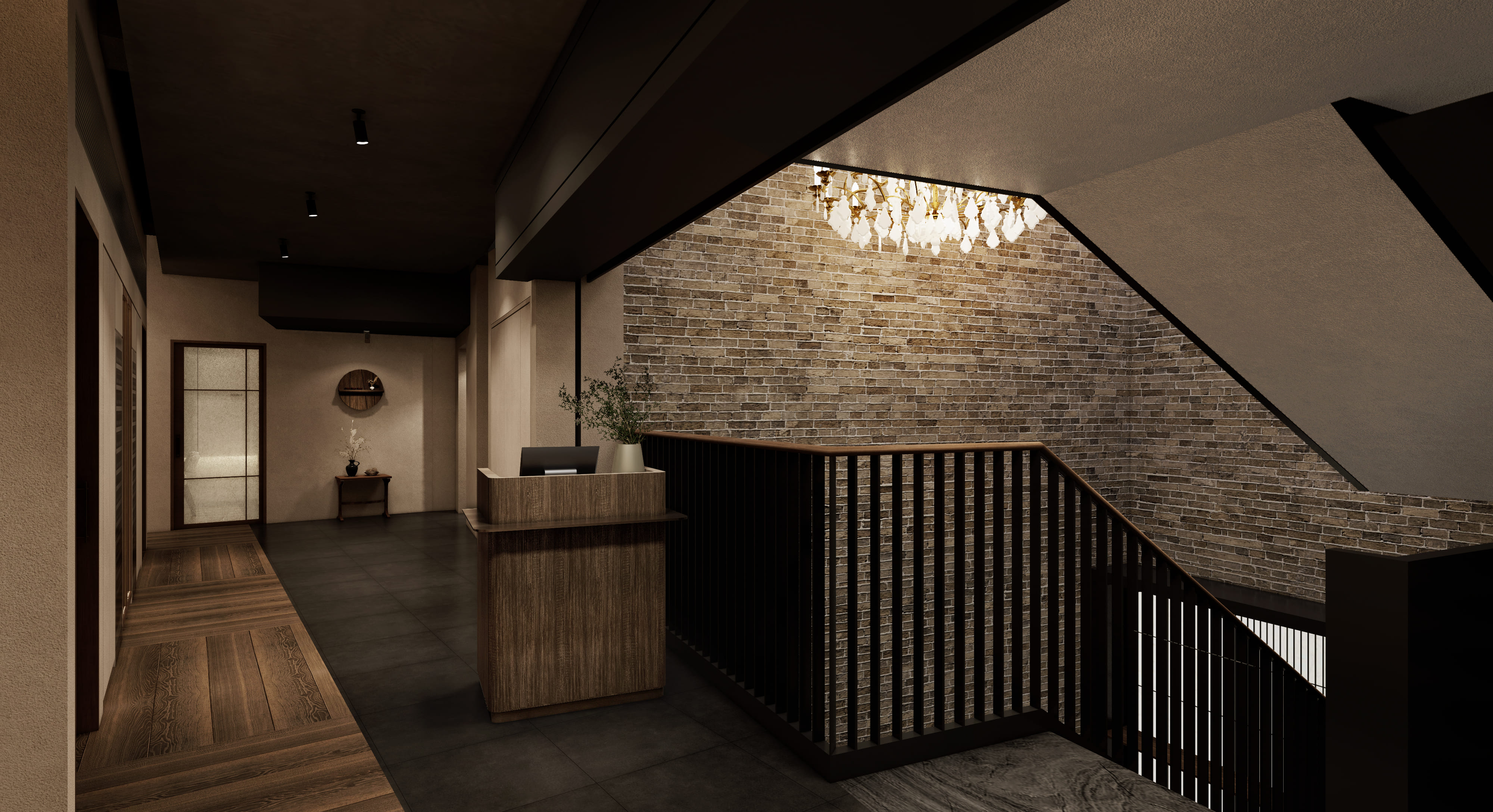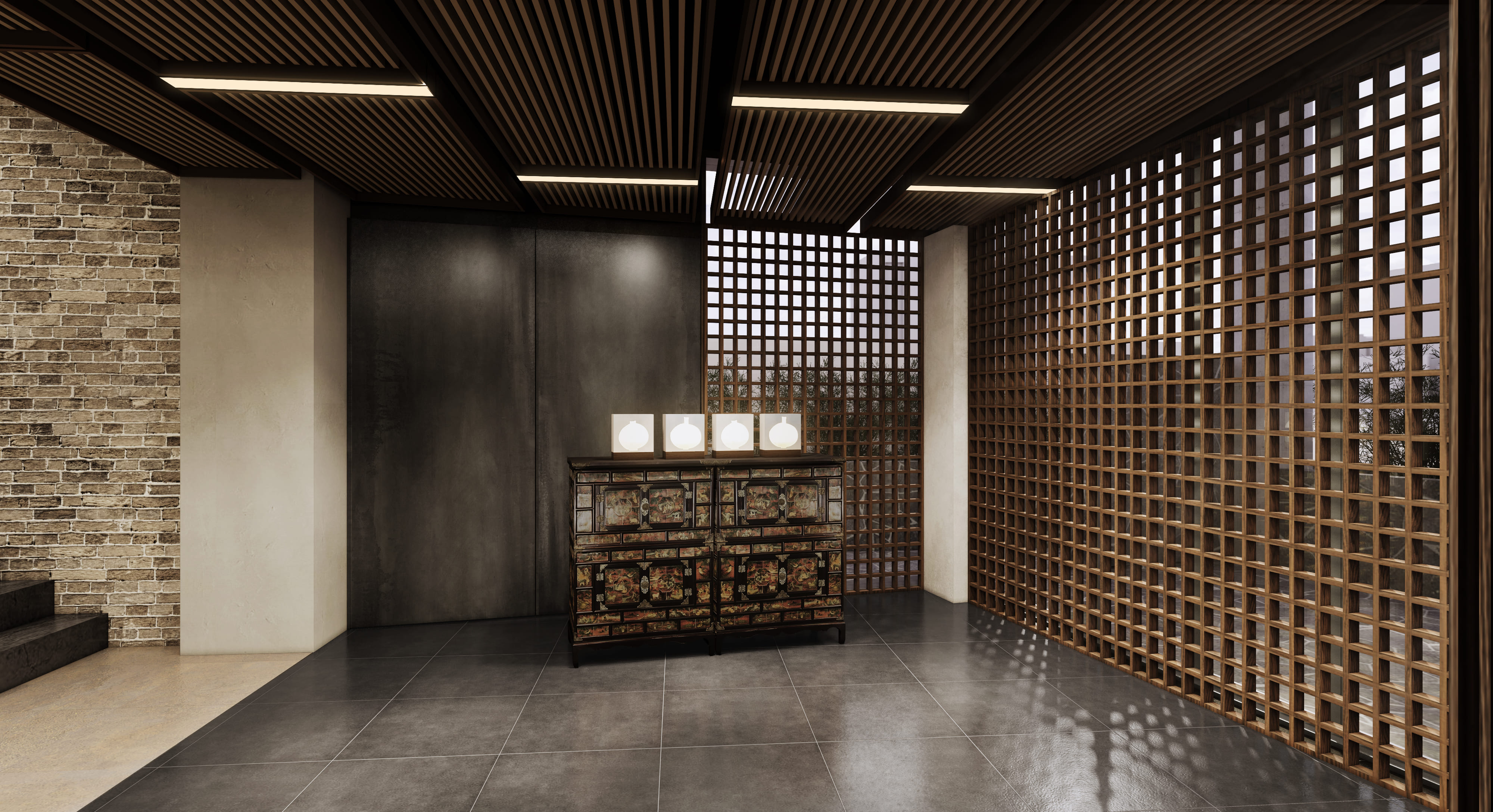 문을 여는 순간 커다란 우드 도어와 정돈된 조명이