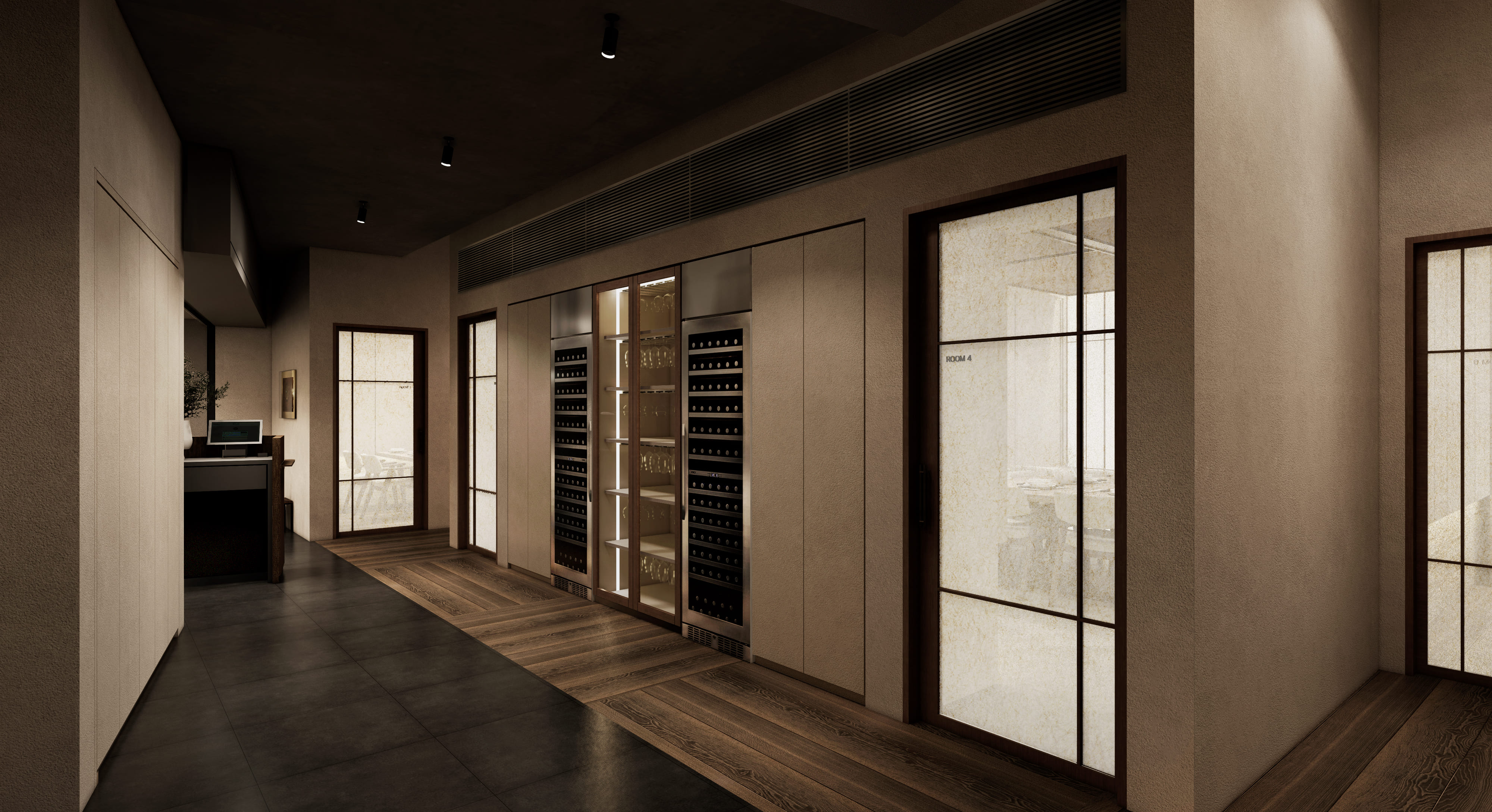 와인 셀러의 잔잔한 반짝임처럼 대화도 자연스럽게 차분해집니다.