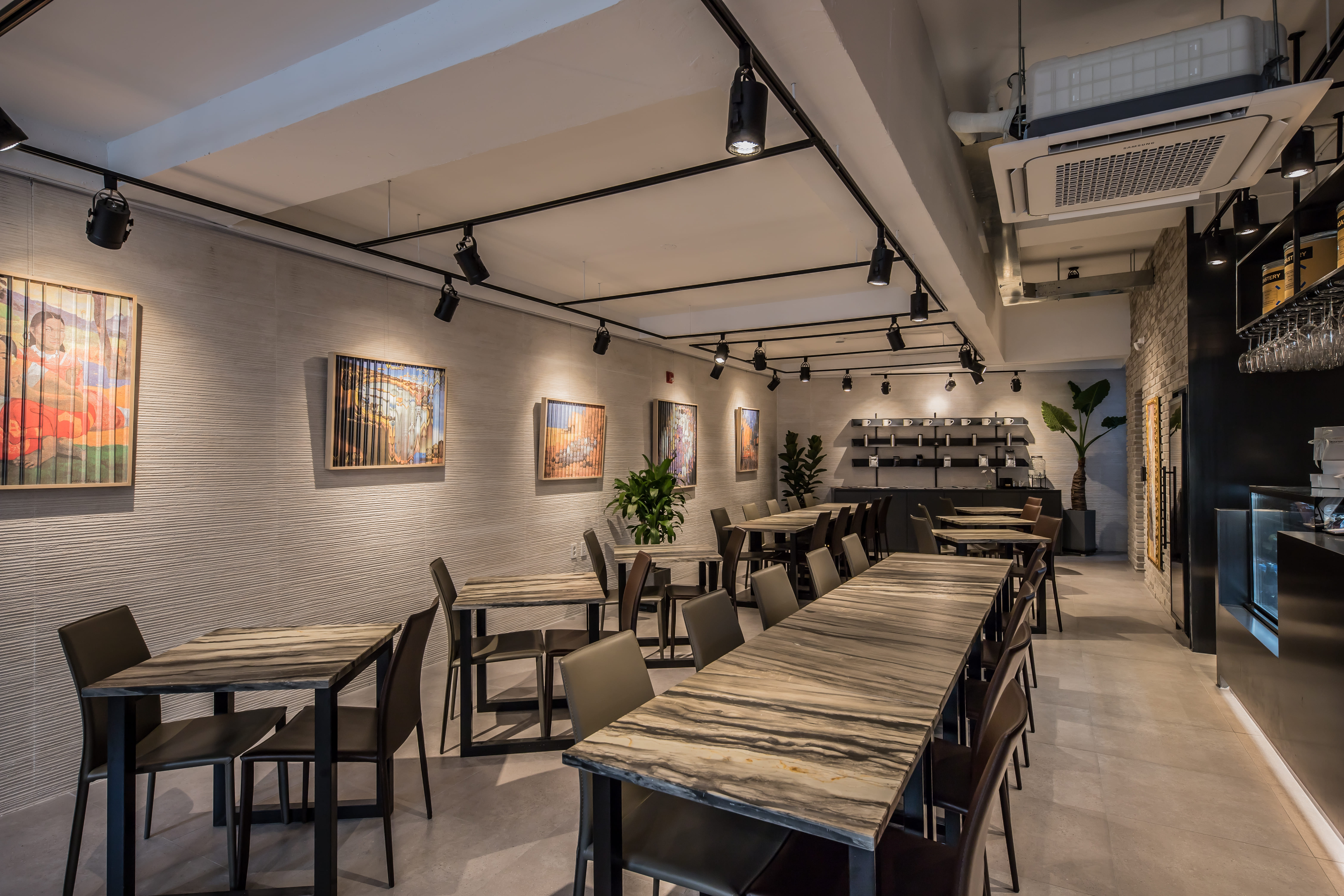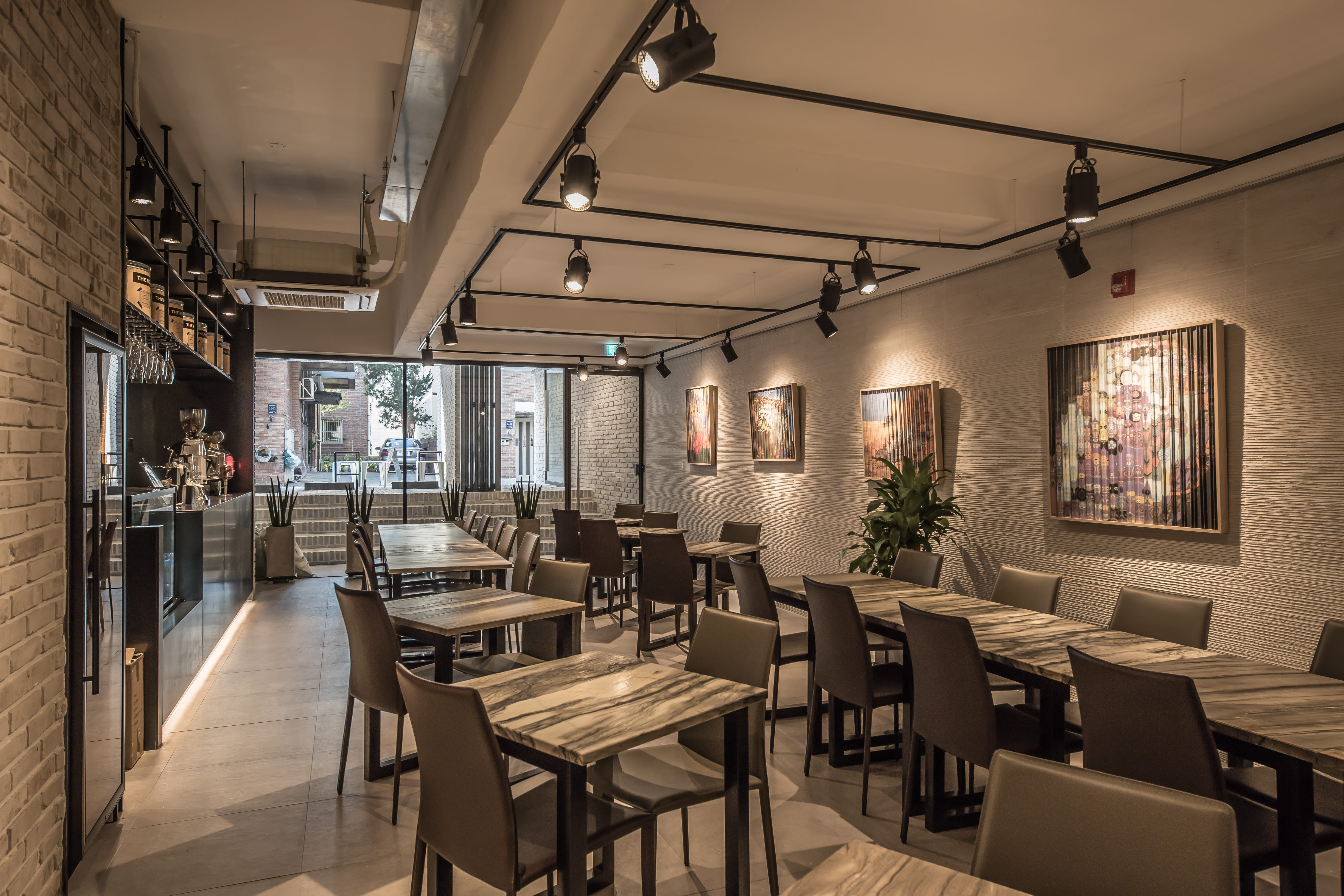 천장 트랙 조명 아래 여유로운 테이블 간격과