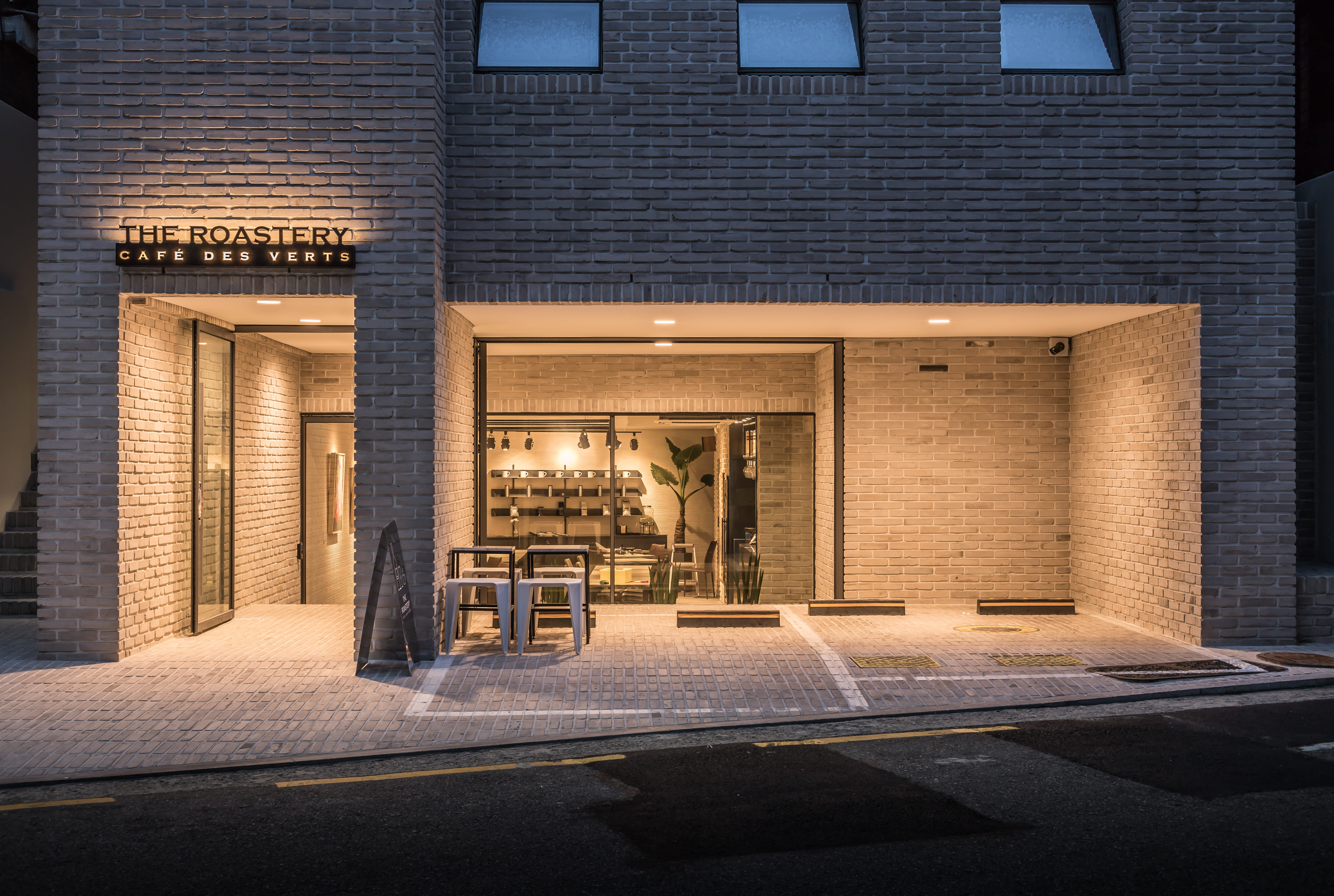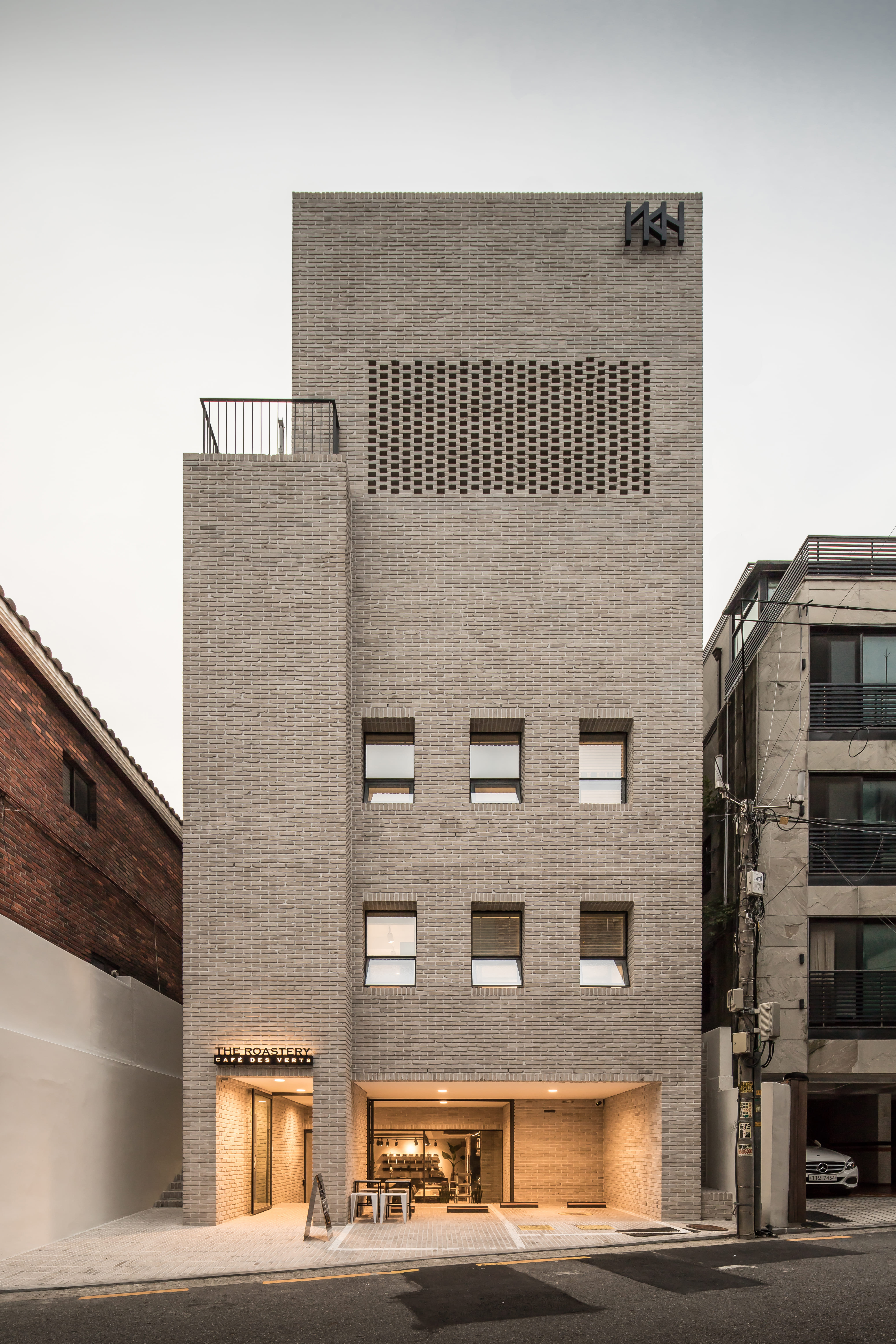차분한 그레이 톤의 벽돌 외관과 절제된 건축미는